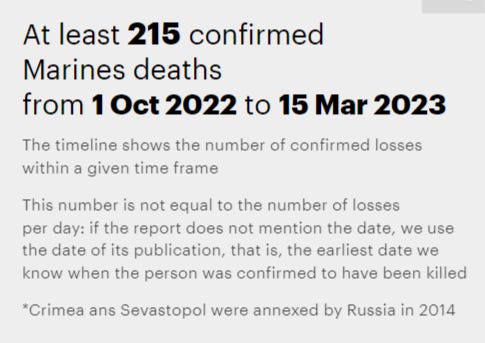 It’s the Ukrainian side openly admitting to unfathomable losses, as in the case of the 72nd where entire battalions were reduced to a dozen men. In Russia’s case, recall how they said untold thousands were lost in the first Ugledar assaults in February 2023. Yet I have shown before that MediaZona’s own numbers debunk this. The site allows you to search specifically for Marines, which was the attacking force back then, and further filter the losses by month. Just to be generous, I put October 2022 to March 2023, though the infamous attacks where “major losses” of Russia’s Marine columns were seen occurred in February. But for that entire period of nearly six months, they only count 215 casualties: