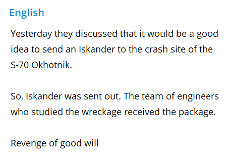 Lastly however: every competent first world military on the planet has doctrinal contingency to strike their downed equipment if it is in danger of falling into enemy hands. The US has done this countless times in Iraq, blowing up their own helicopters, tanks, planes, etc., on the ground. Why Russia could not have destroyed the S-70 crash site with a well-placed Iskander is beyond me and shows potentially deep flaws in Russian operations which stretch back to the start of the conflict where many first-rate prestige systems were abandoned to be captured by Ukraine, rather than somehow sabotaged or blown up via strike. Given that the object was so close to the contact line, any number of Russian scout drones like Orlans and Zalas could have pinpointed the location and sent a package there. Maybe that was done after the videos above? We don’t know for absolute certainty.