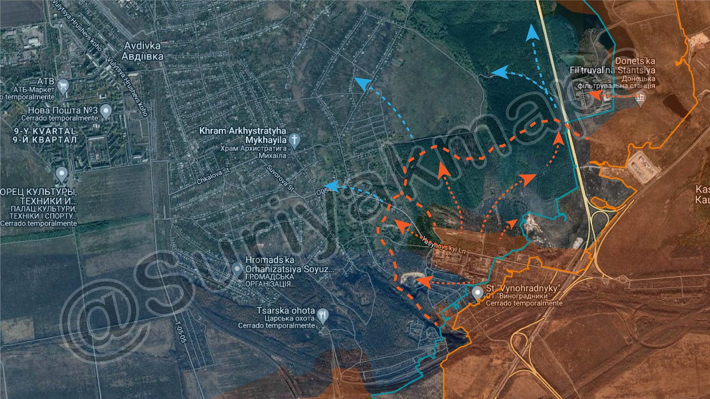 After the capture of the Promka industrial zone the next objective for #RussianArmy would be the capture of the Vinogradniki quarries and farms from where they can monitor the Ukrainian movements in the forest zone, precisely the penetration into the urban zone will continue to be reduced by taking new parts of the Yasynovatskyi avenue from where to establish fire control over the lower part that divides the city. Simultaneously the Russian troops will seize the forest zone reaching the rear of the Ukrainian defenses along the H-20 in order to achieve the solid control over the Donetsk filtration station. However, as previously stated, the Russian advance will be difficult due to the large number of defenses in this forest zone and a collapse of forces is not expected as long as the northern front does not make progress.