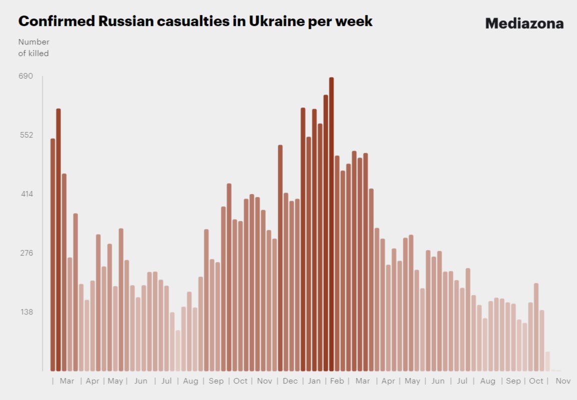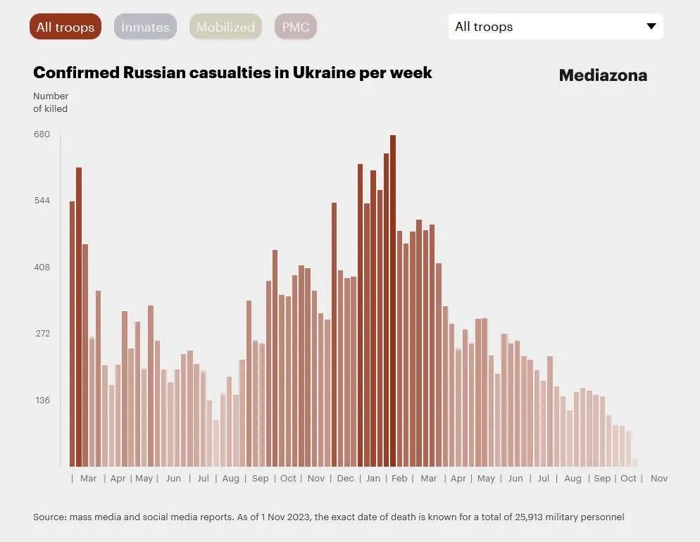 Lastly, to keep things fair and balanced, recall I’ve previously posted MediaZona’s low casualty count for Russian forces in October as evidence of loss exaggeration in Avdeevka: