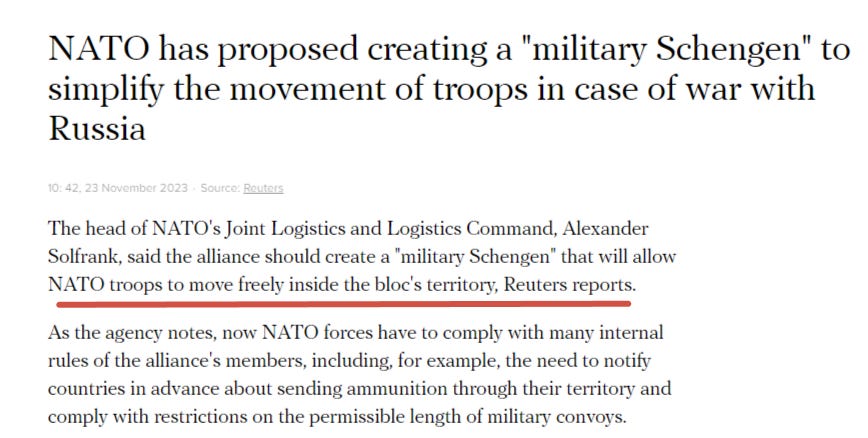 The bellwether was the latest announcement that NATO wants to create a military Schengen zone in Europe, which would allow all European armies to freely move between countries, relocating large swaths of troops in record time without the paperwork and waiting:
