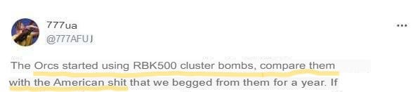 On the Ukrainian side on the other hand, they are reportedly getting to catastrophic levels owing to the introduction of heavy usage of Russia’s cluster munitions. Shocking videos like this and this began to make the rounds soon after videos of Russian cluster attacks appeared. The AFU seems to compare Russia’s new clusters quite favorably to the American ones they got:
