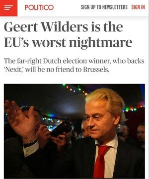 In this case, it’s the same thing. In fact we can see that this very same “military Schengen” was talked about from 2017 onward. And there are many new and coming obstacles that could throw a wrench into this whole plan. For instance, from the above wiki we see the initial plan revolved around the Netherlands as key central node, and lo and behold the recent news of Geert Wilders’ “stunning victory” has upset the apple cart: