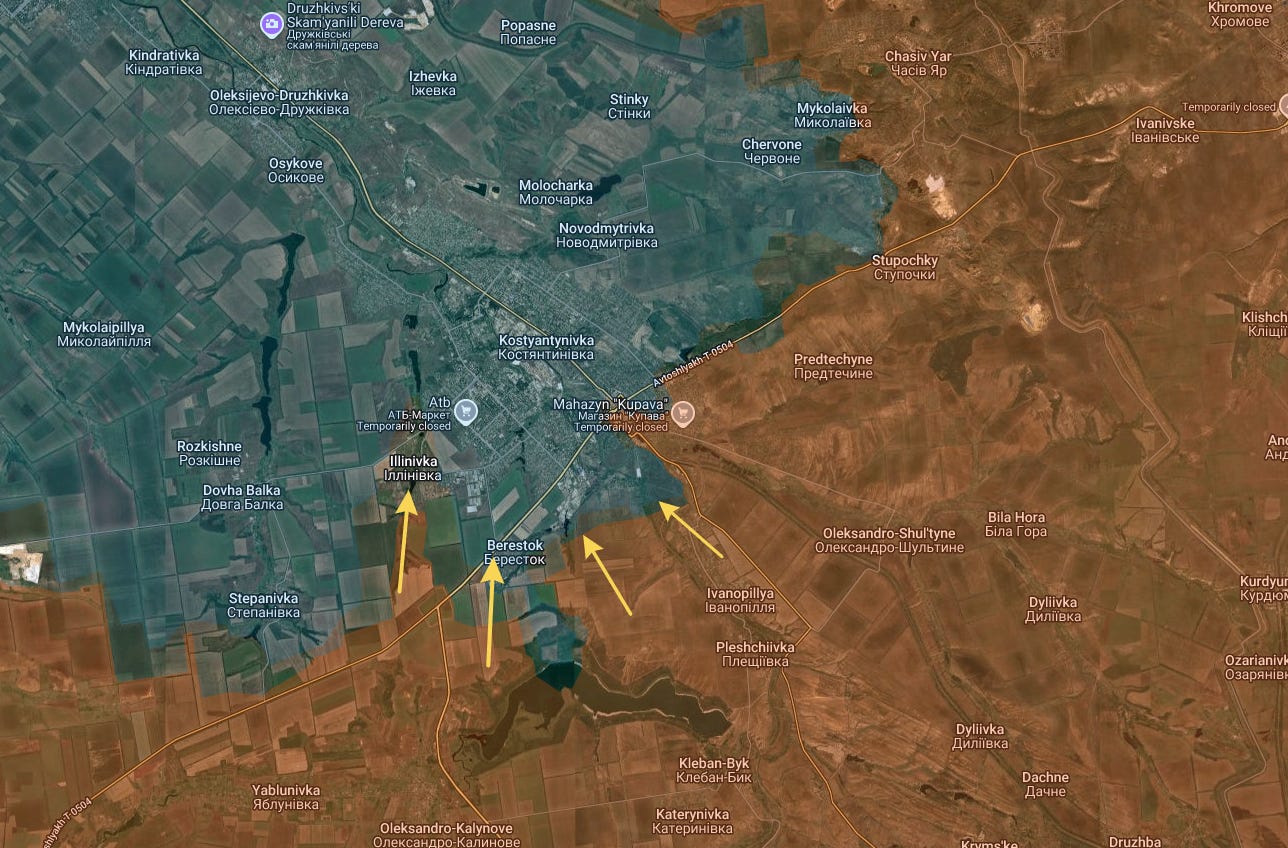 In Konstantinovka, Russian forces likewise captured all the ‘dead space’ around the city’s flanks in the area of the yellow arrows, facilitating the next infiltration phase about which Ukrainian analysts are now gravely concerned: