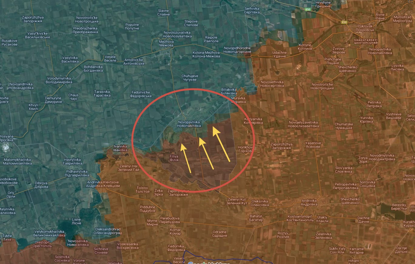 Moving further to the east, Russian forces captured most of the open area on Novopavlovka’s eastern and southern flank, seen below in the darker colored region under the yellow arrows: