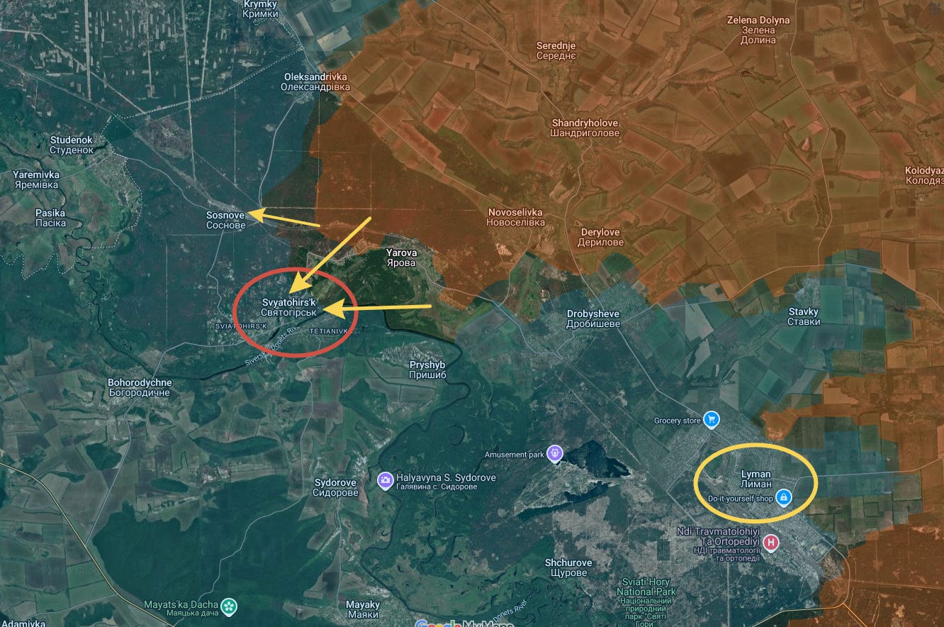 The Krasny Lyman direction has seen the most movement after western Zaporozhye. Russian forces have actually begun assaulting and entering Svyatogorsk, which we had predicted they would begin doing in the last full frontline update several weeks ago: