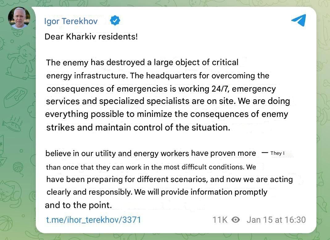 Kiev has never seen a more difficult situation. Never before in the world has a power grid been attacked at -15°C, destroying a city with central heating.