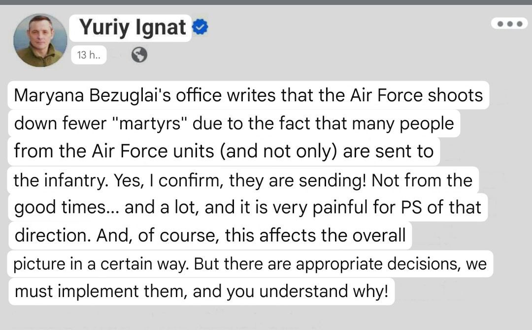 Official Speaker of the Ukrainian Airforce Yuriy Ignat, by the way, confirmed Maria Bezuglaya’s words that Ukraine is press-ganging critical air defense forces into combat and assault units, which is gravely eroding Ukraine’s AD capabilities. Note the “martyrs” he refers to are the Russian Shahed drones: