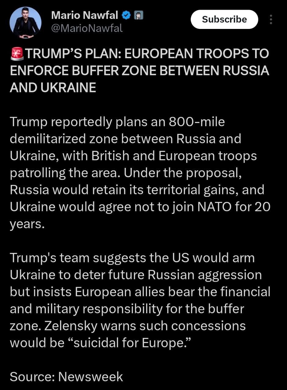 Trump’s “rumored” initial plan, however, is a prima facie mediocre and unimaginative one: Korean-style DMZ with “European troops” staged as trip-wire forces, which has animated Western crowds into flights of fancy: