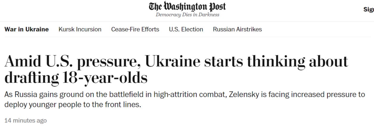 This is the one area Zelensky has shown backbone of late, completely refusing to bend to his masters’ will on this issue, partly because he’s aware the trap being set for him. Washington wants nothing more than to use Ukrainian cannon fodder to weaken Russia and Zelensky is finally catching up to the ploy: now he’s only willing to lower the age in a quid pro quo for much more military arms.