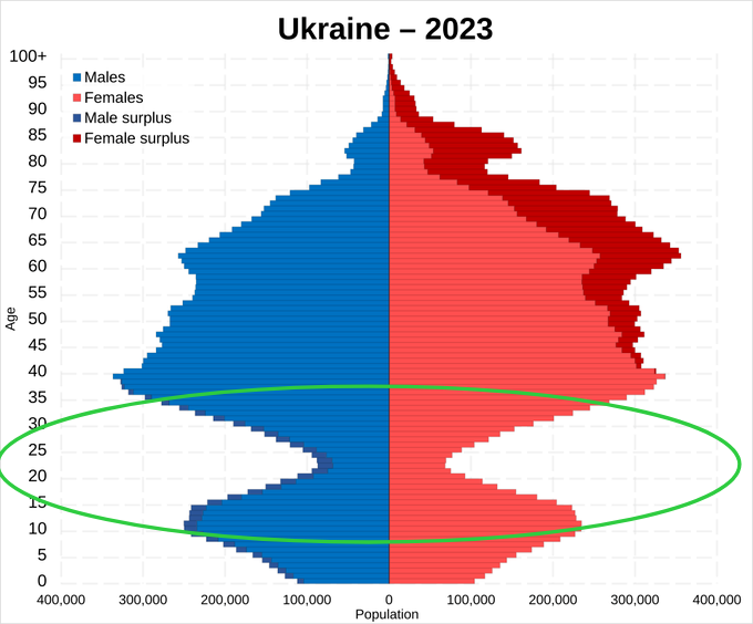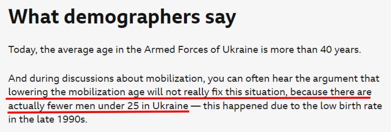 The problem is, a new BBC piece laid out a devastating data point: that Ukraine actually has very few under-25s due to the fact that the 90s saw a sharp decrease in birthrates. We’ve covered this before here, but essentially it means the cohort of males born from the mid to late 90s onward is very small compared to the older groups.