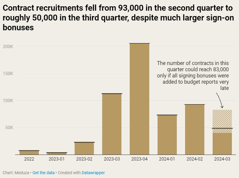 According to this, first and second quarter of 2024 achieved about 70k and 95k recruitments, which would be ~23,000 to ~33,000 per month. Recall Russian officials repeatedly gave a figure of about ~30k per month recruitment.