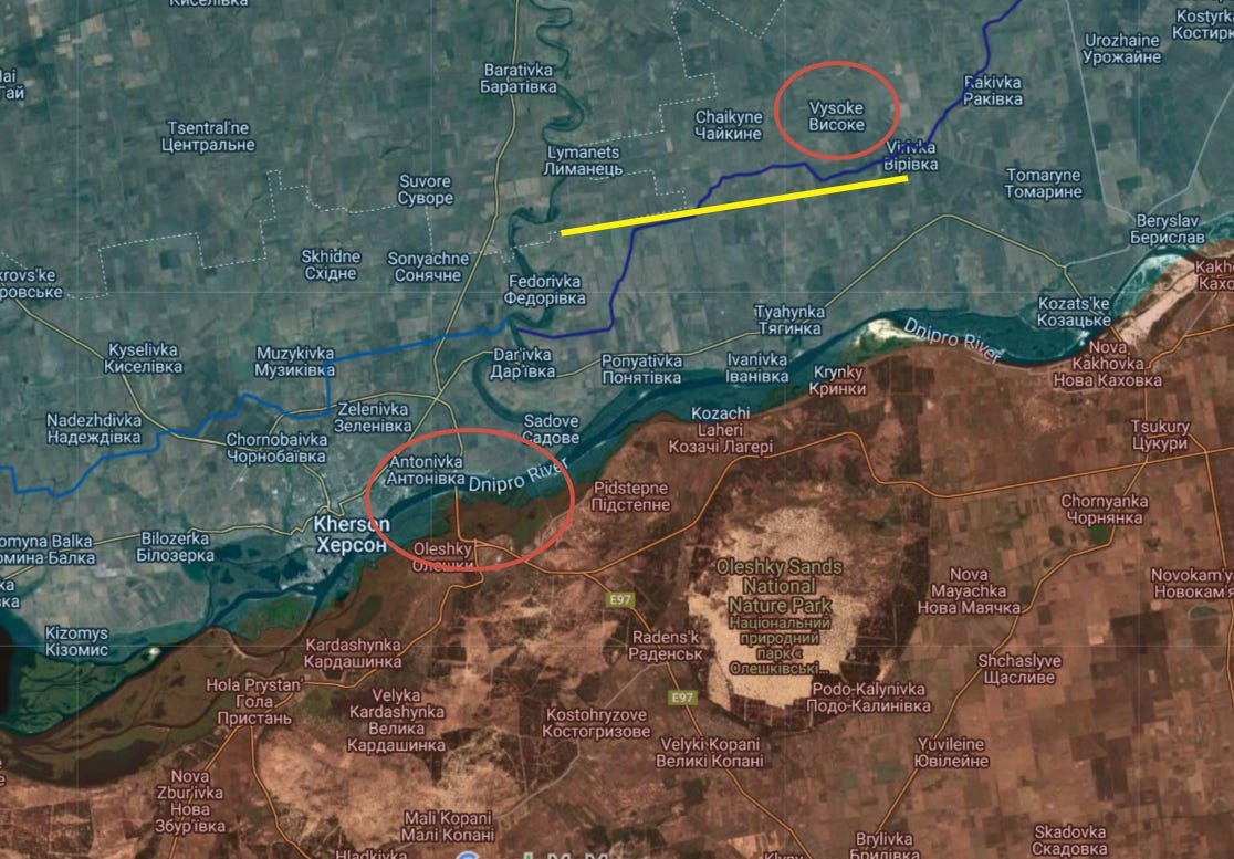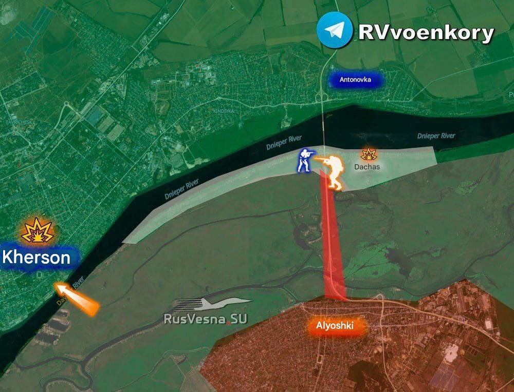 ▪️ Zeynalov reports that Russian fighters were able to gain a foothold on the left bank in the Dachi area, which they can use as a springboard to attack the right bank, Antonovka and Kherson.