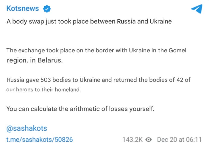 December 20 exchange: 42 Russian bodies vs. 508 Ukrainian bodies.