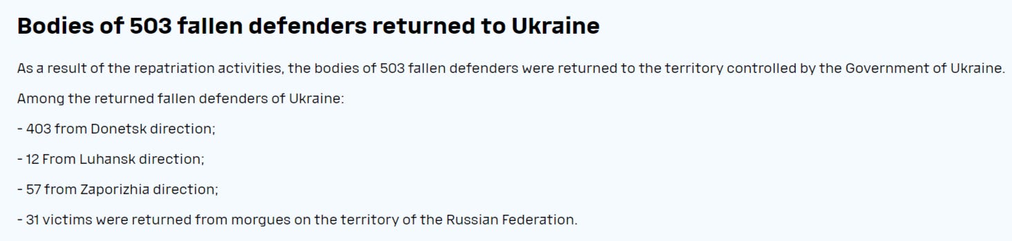But this is still just ‘hearsay’ from the Russian side. So now we turn to what Ukrainian officials reported. The official Telegram channel for the ‘Ukrainian Coordination Headquarters for the Treatment of Prisoners of War’ reported on the exchange of bodies. This organization is part of the Cabinet of Ministers of Ukraine and appears to be headed by Budanov himself since 2022. Their official website is here, which also reported on the exchange, even listing precisely where all 503 Ukrainian bodies were from: