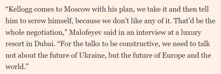 Given that it’s said Malofeyev has Putin’s ear, his words carry weight. And not surprisingly, he refers back to Putin’s long-held requirement that any closure to the Ukrainian conflict must include a grander reconfiguration of the entire broader regional security architecture: