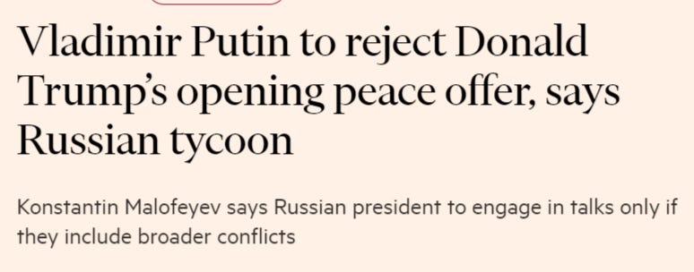 Now Putin-linked Russian billionaire tycoon Konstantin Malofeyev has shaken things up by announcing that Putin stands to abruptly reject these proposed opening offers: