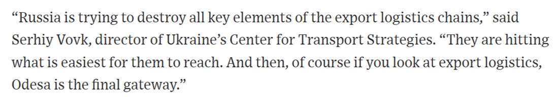 Since 90% of Ukraine’s staple agricultural exports leave by sea, that means for Russia to shut down the ports with strikes leaves Ukraine scrambling to desperately get product out by rail. Hitting the railways also essentially blocks the last possible route and leaves Ukraine without options.