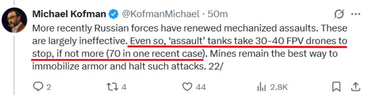 As can be seen, the recent ‘cope cage’ advancements have effectively made many armored vehicles nearly invulnerable to drones. You simply will never be able to stop an endless supply of anything. Even small-arms rounds will eventually stop a tank if you fire enough of them. Eating 70 drones before being stopped could only be considered a successful defensive system—and 30-40 is not much worse. The problem is, drones are so ubiquitous that apparently even that is not quite good enough, but many Russian armored assaults still successfully ward off these drone attacks and are only eventually stopped by some combination of mines and other munitions.