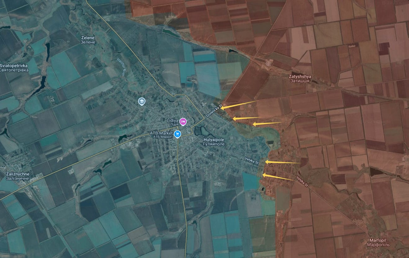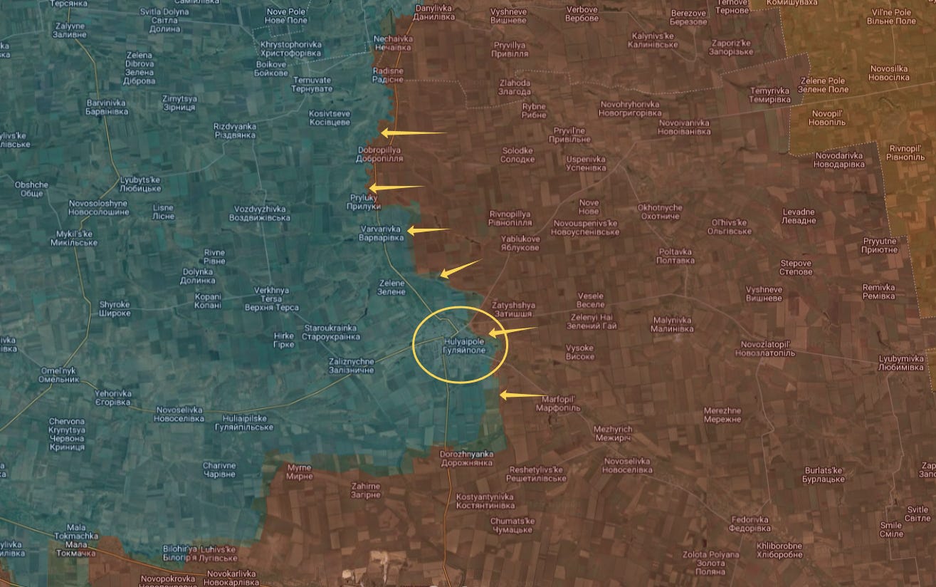 On the front, Russian forces have captured nearly everything up to the Haichur river, with Gulyaipole now cut off from logistics on all but one side:
