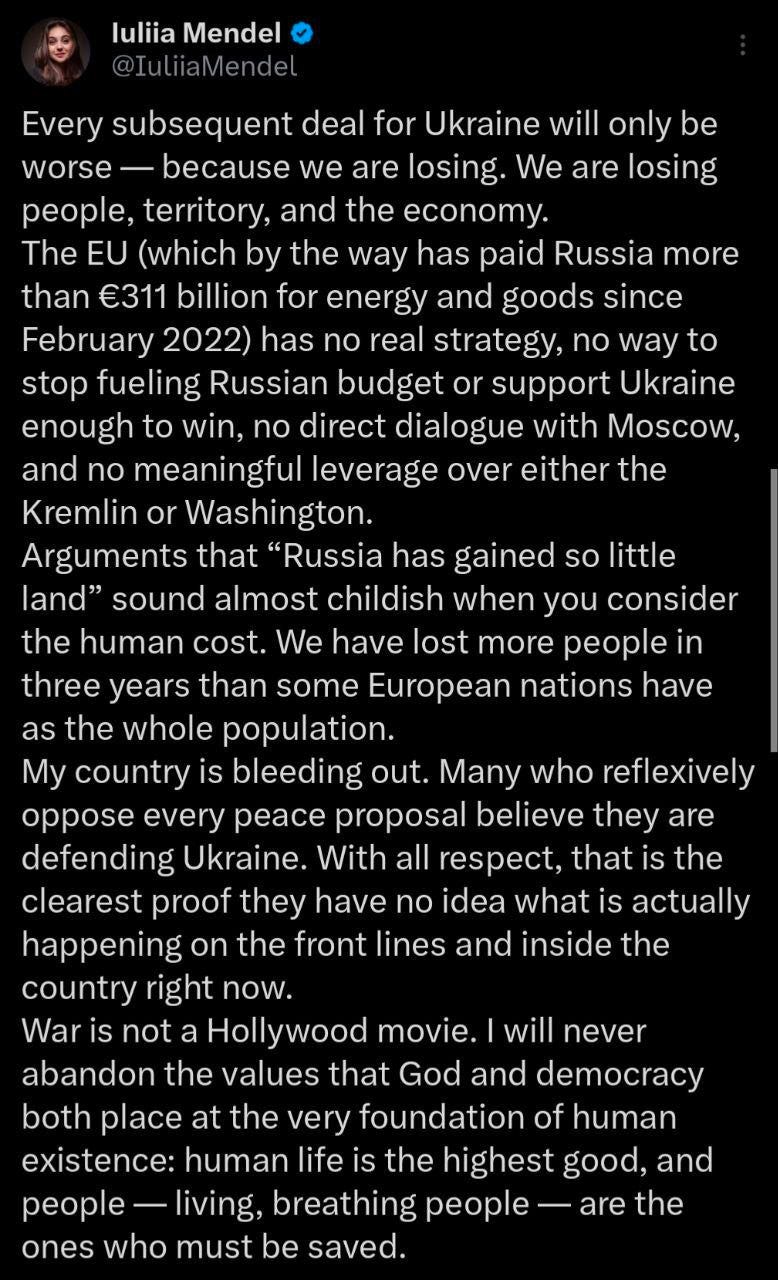 The situation on the front, as always, continues to get worse for Ukraine. A series of posts from Ukrainian officials and military figures highlights this. First, from former press secretary to Zelensky, Julia Mendel, is a must-read: