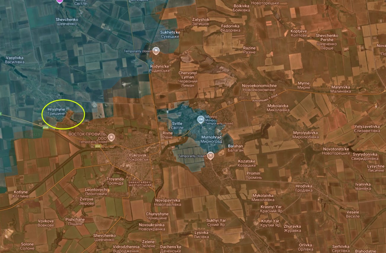 It can also be seen Russian forces have been storming neighboring Grishino, circled in yellow above.