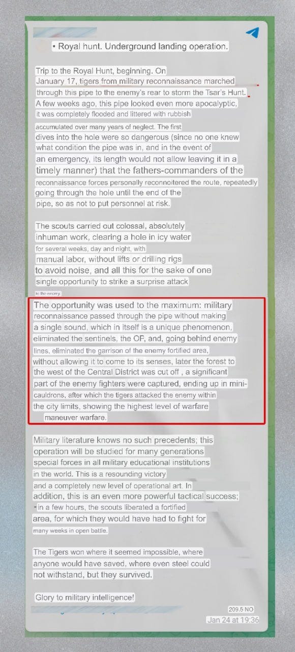 Let’s turn to Ukraine for a moment. There are a few interesting updates. A fascinating story has come to light regarding how precisely Russian forces were able to win their way into the Tsar’s Hunt area of southern Avdeevka. It turns out they were able to cut their way through a drainage pipe hundreds of meters behind enemy lines, waiting until a very foggy day to pop out in the rear and liquidate and capture an entire detachment: