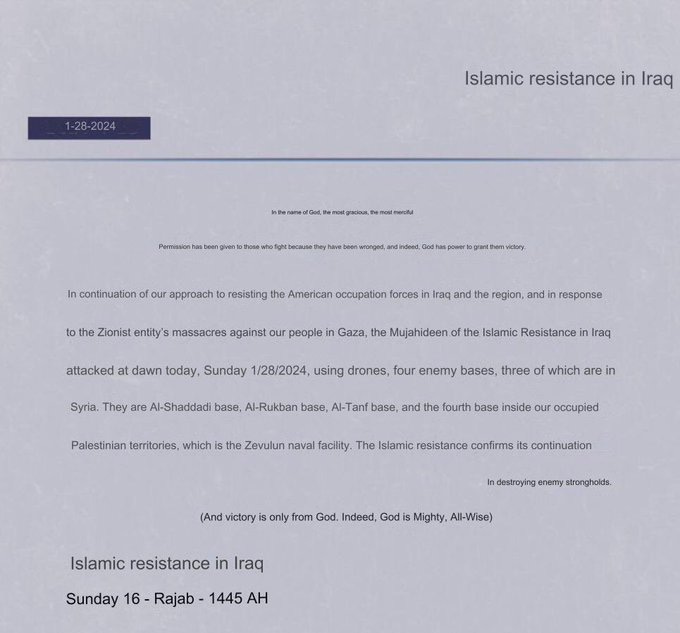 There seems to be some major disagreement or deliberate obfuscation on US’ part as to where the troops were hit, exactly. The above resistance statement says multiple bases were hit. Most are assuming the fatalities were in al-Tanf base in Syria—the illegal base the US uses to facilitate ISIS and train terrorists to agitate against Assad, as well as to block the all important Syria-Jordan border-route to keep Syria isolated and economically stifled.