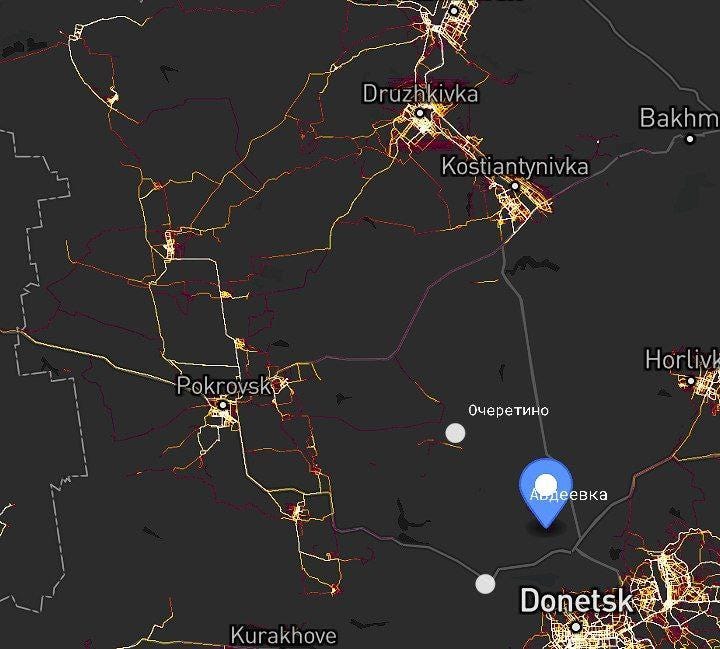 AFU sources were furious in discovering one of the methods that the Russian forces reportedly used to surveil Ukrainian units in the region, particularly noting their main supply routes. It turns out Russian forces were able to use GPS signal hotspots from Ukrainian phones, which showed the most common routes they take in and out of Avdeevka, shown here: