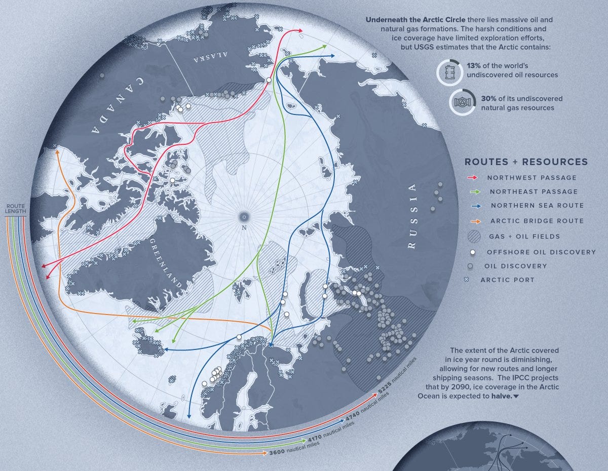 China also has access to the Northern Sea Route in the Arctic Ocean. The West does not have access to this route because these are Russia's territorial waters.