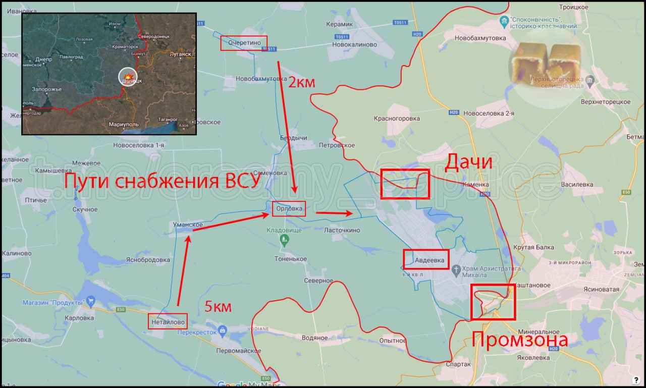 APU supply routes were determined by the activity of GPS sensors in the Avdeevka area using Yandex services. Based on these data, the Ukrainian Armed Forces have two supply routes for their group in the city: northern and southern. The northern route begins in Ocheretino and runs through Novobakhmutovka, Berdychi and Semyonovka. The southern route goes from Netaylovo through Umanskoye. In the Orlovka area, both paths combine into one and, passing north of Lastochkino, reach Avdeevka.