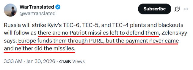 Note in particular the part about the PURL (Prioritized Ukraine Requirements List), which I had debunked before as a scam meant to give the impression of European “solidarity”. Here we see just how “effective” it has been.