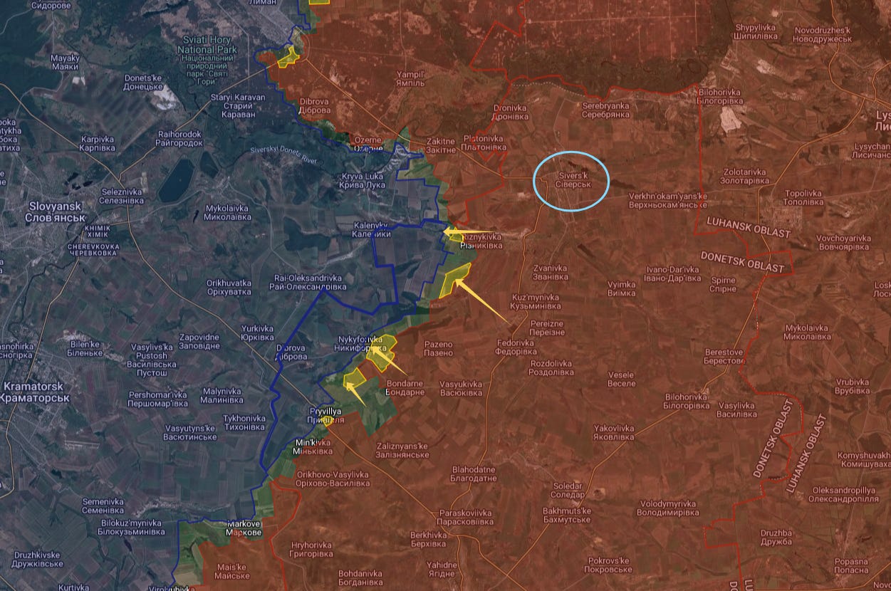 Switching to AMK’s maps, we see further north on the Seversk line that Russian forces are slowly inching westward along the broad front—the yellow areas are newly captured positions: