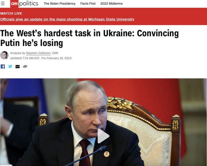 A few last points about how things may unfold soon. Firstly, there’s been rumor that Zelensky is ready to “pull” Bakhmut completely, but was saving it for the sake of Biden’s visit, as he didn’t want to spoil the optics of the visit’s grand overtures by having a deflating ‘mass retreat’ from Bakhmut crowding the headlines. Bakhmut is in dire straits and Wagner continues advancing and enclosing it from the north. So now rumor says Zelensky will order full withdrawal by the end of the week. And this tolls with several other sources we’ve had from the Russian side which forecasted a fall of the city in a week’s time (though Prighozin himself demurred with the projection that it could take well into March to capture).