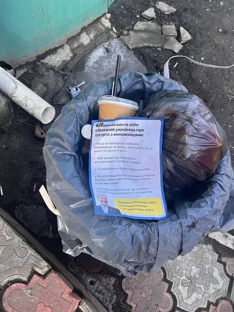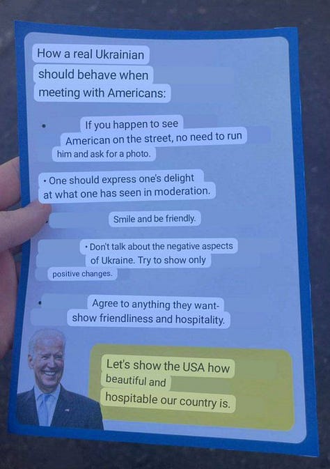 Today the ol’ Crypt Keeper stalked through the streets of Kiev in a parody parade, with phony alarm blaring in pretend mimicry of ‘war’. As the mummy stiffly sleepwalked and pantomimed through the deserted streets, friendly SBU agents dispersed these ‘helpful reminders’ to the debased burghers of what-was-once Kiev, who may unwittingly commit the faux-pas of gazing upon the sacrosanct American presence sweeping through their streets: