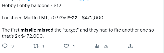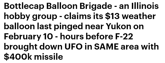 And as for the balloon saga itself, it ironically served to deflate the stature of U.S. Airfarce capabilities. Not only did it turn out that the stealth F-22—which, after nearly two decades of being in service, has yet to record a single real combat kill, exempting the balloon of course—used its $400k Raytheon stocking-stuffers to shoot down what turned out to be a $13 hobby balloon: