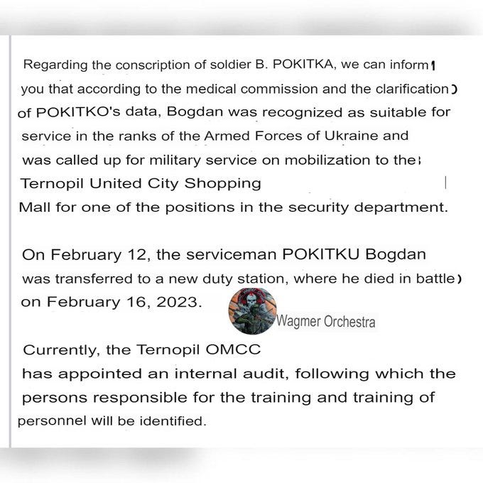 There was a sad bit of news out of Ternopil, western Ukraine, where reportedly the locals were up in arms after it had gotten out that one of their young men, who was forcibly mobilized (read: press-ganged) in a shopping mall in this type of fashion, was given only a cursory (read: nonexistent) training, and sent to the front on February 12. By February 16, he had already perished in battle.