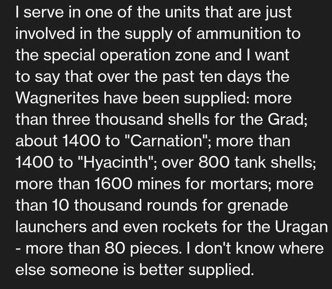 However, two interesting items were shared which shed a different light on developments. Firstly, this message from a purported Russian unit supplying Wagner troops: