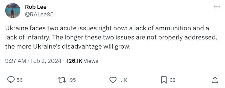 And this is becoming a big theme. Today Rob Lee’s tweet made the rounds, wherein he acknowledged that Ukraine faces a shortage of infantry: