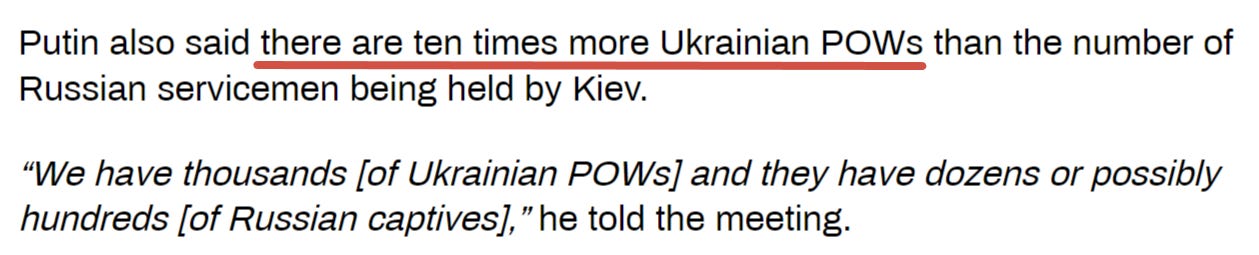 Putin confirmed something I’ve been long proclaiming: that the POW ratio between Ukraine and Russia is 10:1 in Russia’s favor. From RT: