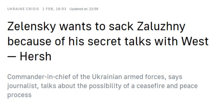 In fact, Seymour Hersh dropped another “bombshell” today claiming that his sources told him the reason behind the coming dismissal is that Zaluzhny has been conspiring with the West to not only oust Zelensky—an obvious point—but to end the war entirely: