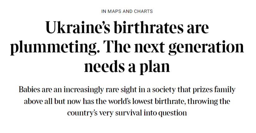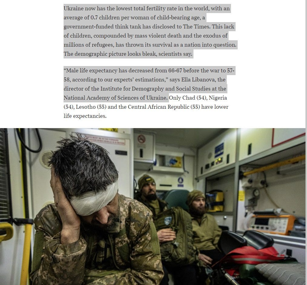 Ukraine now not only has the lowest fertility rate on earth, but its male life expectancy has dropped to 57 years. How low will it go before the conflict ends?
