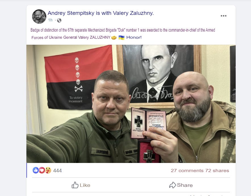 Now an avalanche of new “intrigues” has ensued. For instance: Zaluzhny was involved in a seemingly indirect threat to Zelensky with the posting of this photo, exemplifying his far-right radical nationalist backing:
