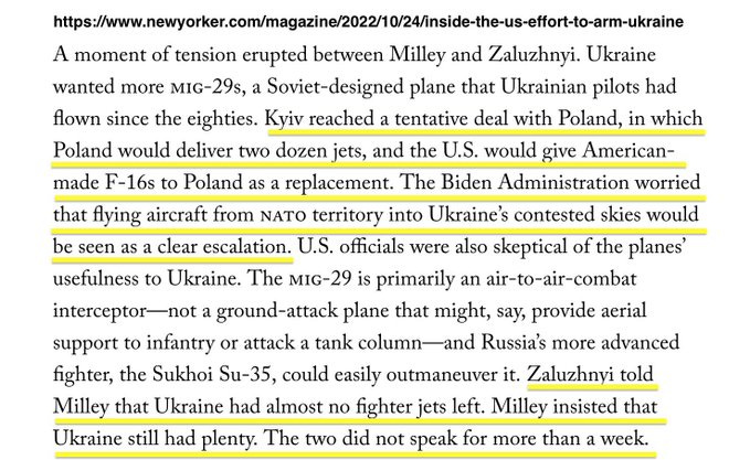 I found this unearthed admission in New Yorker interesting. Zaluzhny told Milley in late 2022 that “Ukraine had almost no jet fighters left”: