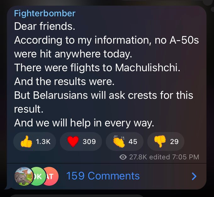 Translation: he’s saying the A-50 wasn’t hit but there WAS an attempt at sabotage—the ‘flights’ he references means drone attacks. Wargonzo already confirmed that at least two large explosions were heard in the airfield. So, it could be that they didn’t hit the plane and either hit the airfield or the explosions were the work of air defense successfully shooting the drones down. Or it could have hit some other object/plane, just not the A-50. Either way this would constitute an attack on Belarusian soil, but as mentioned earlier if it was done by Belarusian ‘partisans’ then Ukraine has convenient plausible deniability here and the situation gets tricky.