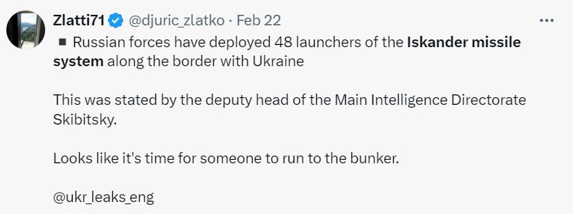 She frankly states that after Avdeevka, Kupyansk may fall—and Kharkov soon after. Recent reports have stated that Sinkovka area, near Kupyansk, is getting ‘critical’ for Ukraine. Not to mention unconfirmed reports that Russia has been placing new Iskander systems all along the border: