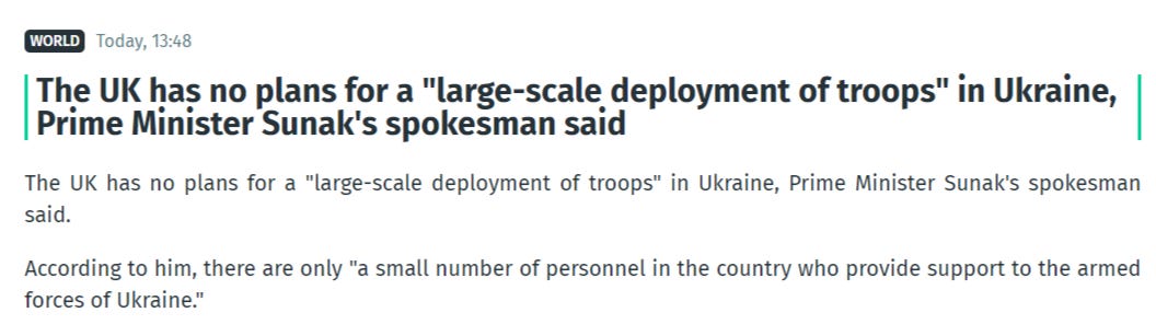 Furthermore, some of the refutations are vague enough to suggest this topic is not totally off the table. For instance, in response to the firestorm Rishi Sunak’s office said UK “had no plans” for “large-scale” deployment of troops in Ukraine: