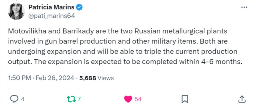 One expert notes that Russian barrel production is set to triple as several dual-use facilities go from producing civilian products to barrels, just like in WWII: