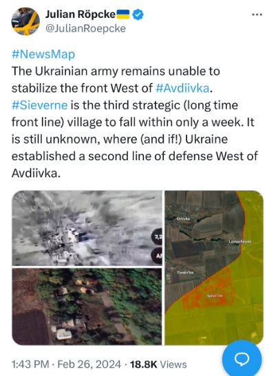 One small nugget I read earlier which gives plausibility to the idea was a Russian military-linked account which claimed that they were surprised how fast the AFU collapsed and abandoned Avdeevka, and—critically—that Russian forces gathered for the final push did not even tap 85% of their concentrated reserves.
