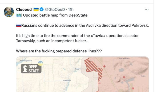 To make matters worse, an ex-Colonel of the SBU continues another one of our ongoing threads from my previous report about Russia’s death by a thousand cuts tactic and how it may soon result in Ukraine’s collapse. Read what he says about the many-vectored attack—specifically about the rapidfire rotation of units that’s not giving Ukraine a chance to reinforce the constantly shifting axes of attack:
